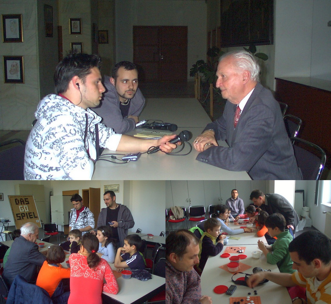-------------------------------------------Domnul Walter Schmidt in 2008, la Casa Adam Muller Guttenbrunn, acordand un interviu jurnalistilor de la Radio Timisoara - proiectul PausenRadio, dupa o actiune de initiere in GO destinata elevilor de la Nikolaus Lenau Lyzeum, cu ajutor de la Cristian Neanu (poza 3 stanga-jos), Viorel Arsinoaia (poza 3 dreapta sus) si subsemnatul in spatele aparatului foto.